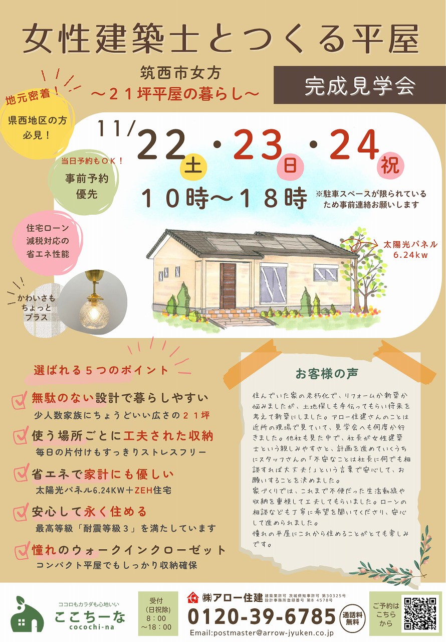 | ご予約方法 | Tel:0120-39-6785 事前予約優先になります。参加ご希望の方は、お電話またはメール、下記フォームよりご連絡ください。 ご予約時にお時間帯をご選択いただきますが、他予約方法などですでに埋まってしまっていることもございます。 こちらからの返信メールをもってご予約確定とさせていただきますのであらかじめご了承ください。 ご希望のお時間帯が空いている場合は当日のご予約も可能です。その場合はメールではなくお電話でご予約をお願いいたします。 駐車場のスペースが限られているため必ず事前のご連絡をお願いいたします。 ※必要に応じて感染症対策を行っております。 見学会お申込みフォーム > |