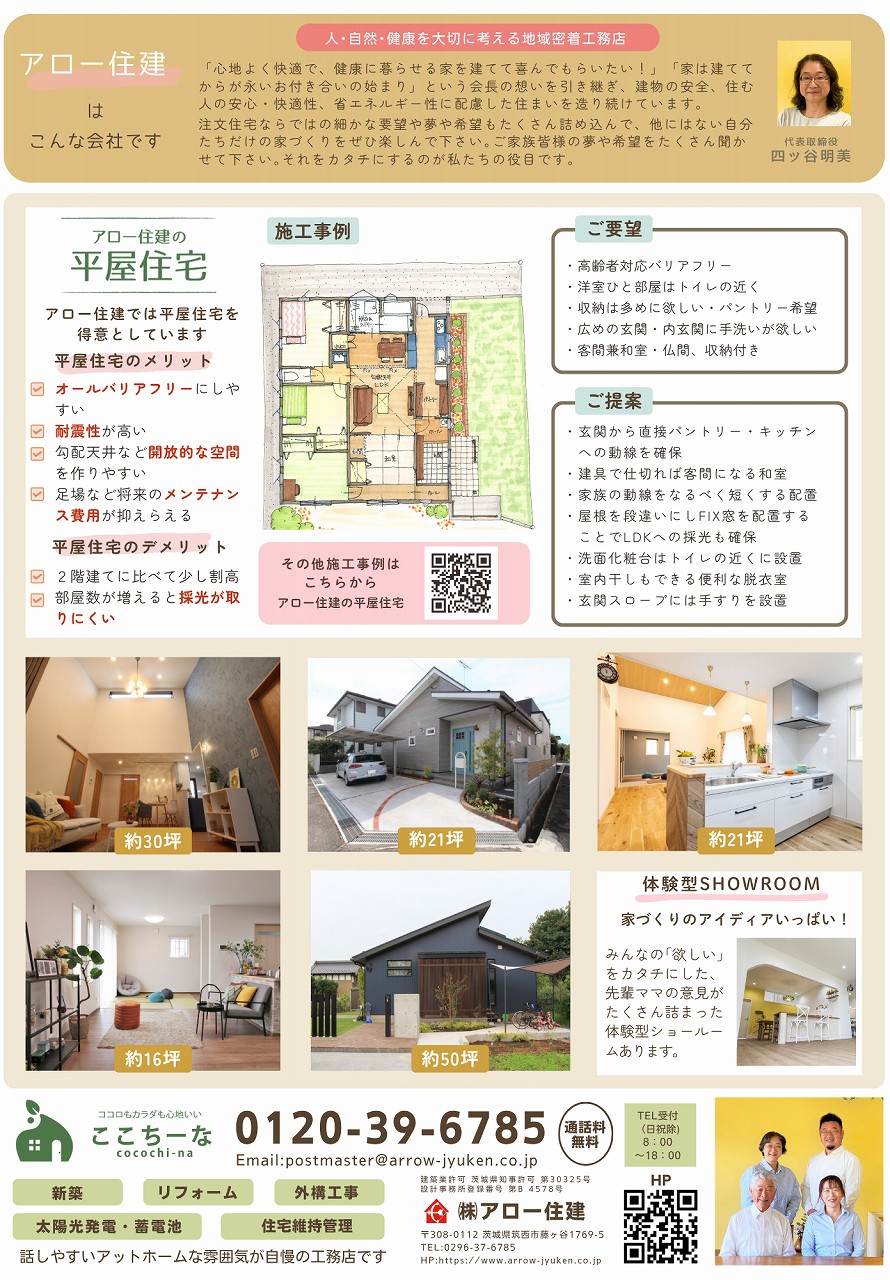 | 詳細情報 | 【お客様の声】 住んでいた家の老朽化で、リフォームか新築か悩みましたが、土地探しも手伝ってもらい将来を考えて新築にしました。 アロー住建さんのことは近所の現場で見ていて、見学会へも何度か行きました。他社も見た中で、社長が女性建築士という親しみやすさと、計画を進めていくうちにスタッフさんの「不安なことは社長に何でも相談すれば大丈夫!」という言葉で安心して、お願いすることを決めました。 家づくりでは、これまで不便だった生活動線や収納を重視して工夫してもらいました。ローンの相談なども丁寧に希望を聞いてくださり、安心して進められました。 憧れの平屋にこれから住めることがとても楽しみです。 【見どころ&ポイント】
